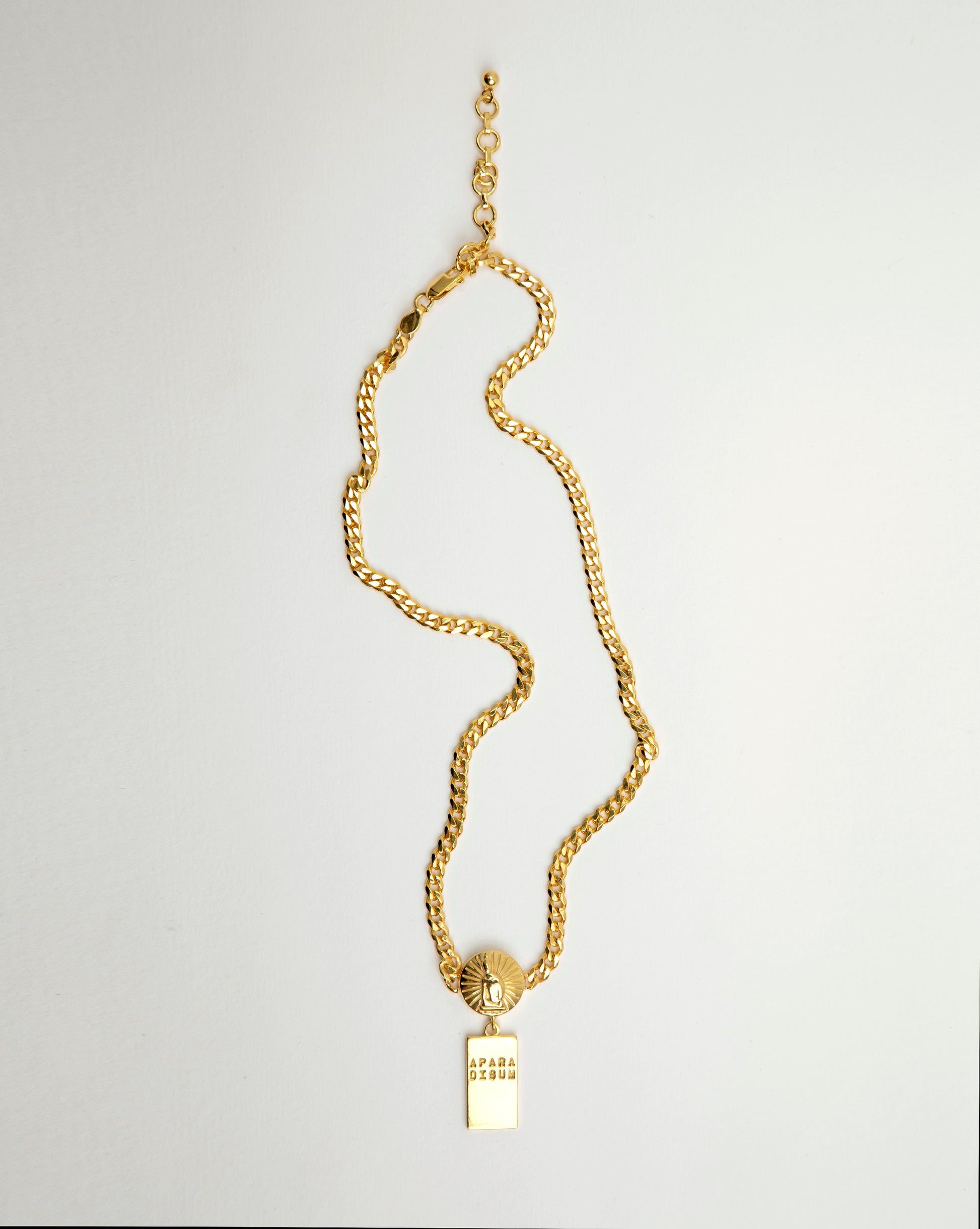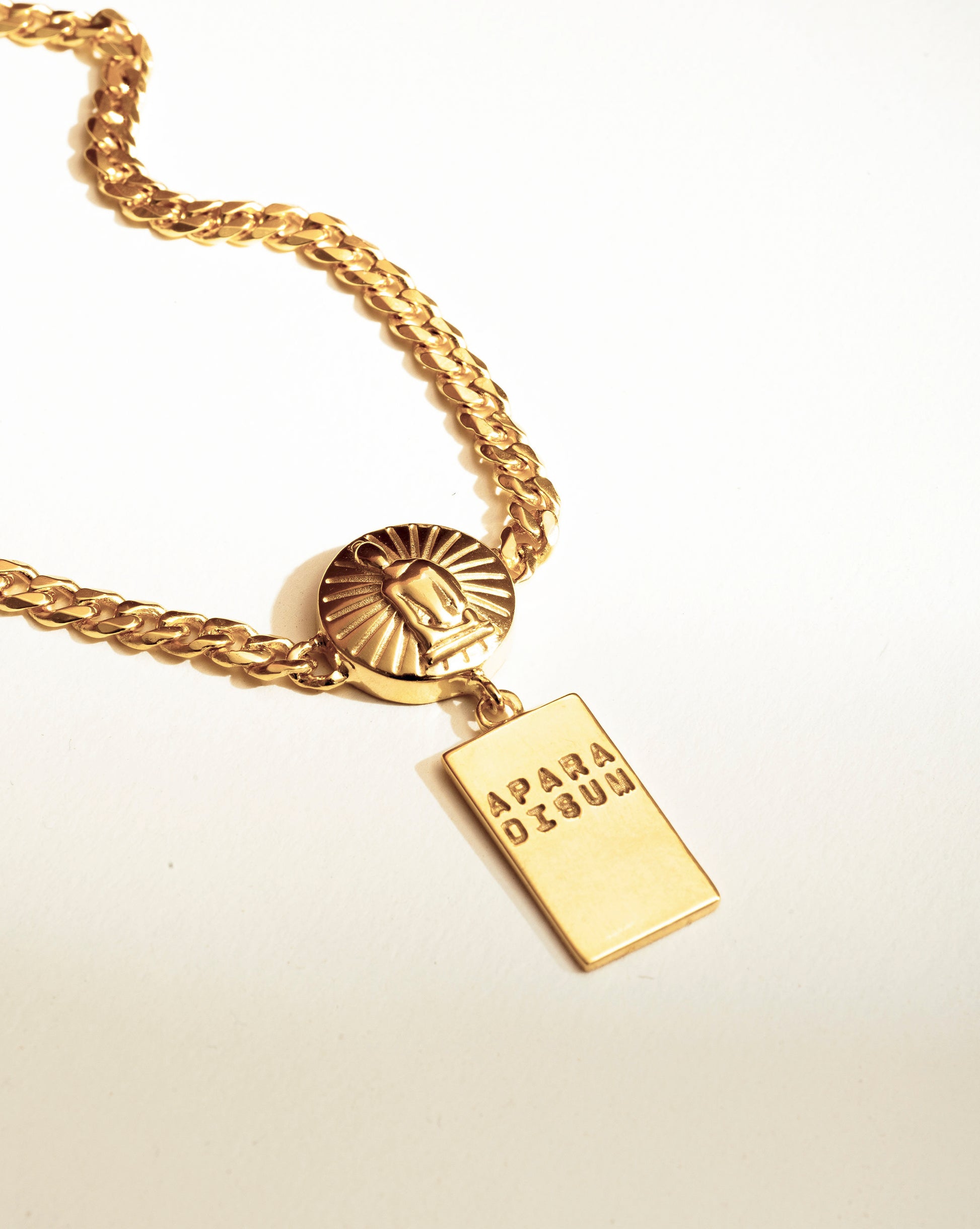 An elegant cuban chain necklace with a logo centerpiece and Apara Disum charm drop, finished to a superb golden chrome.
