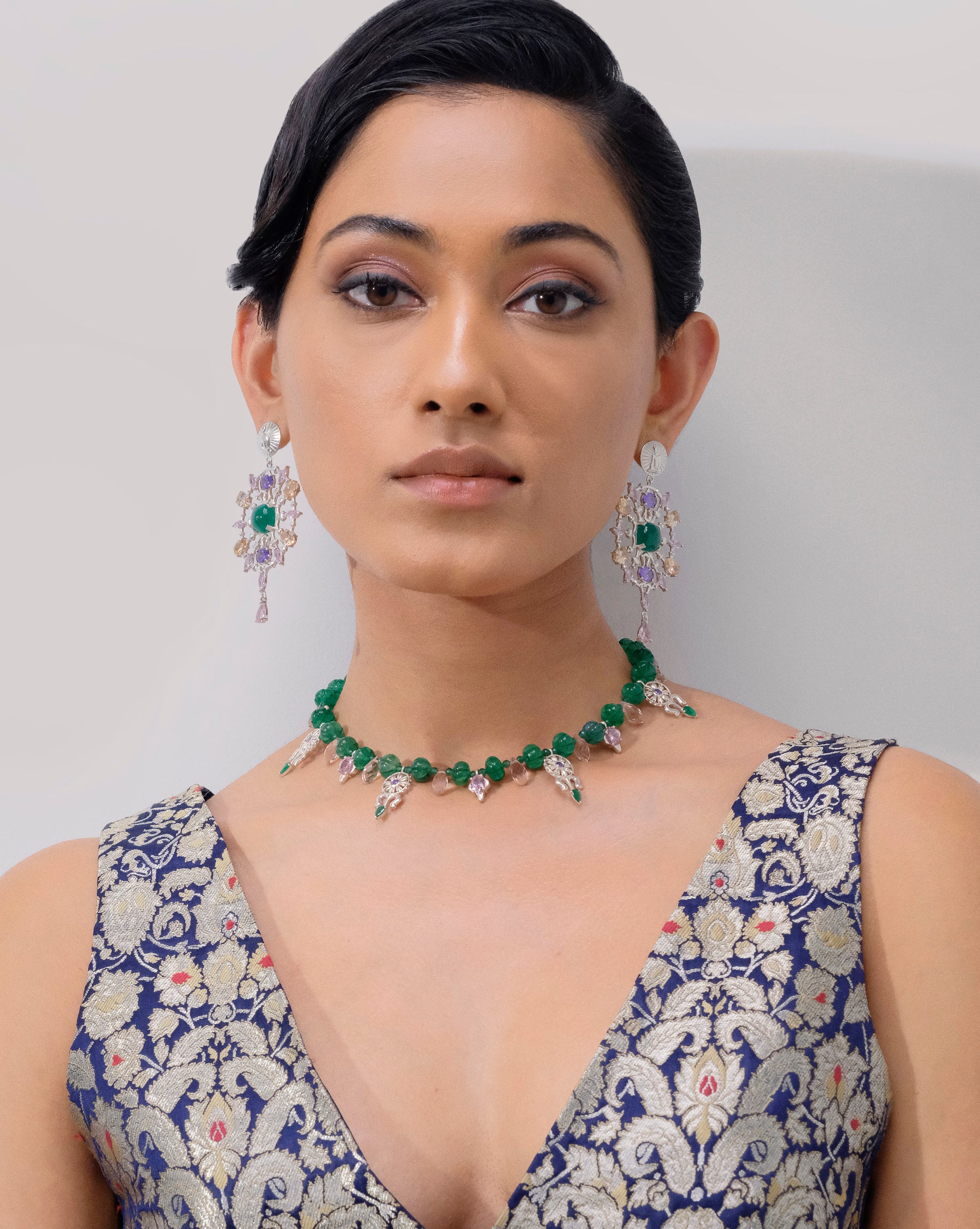 Dazzling and delightful, adorned with vibrant green melon beads and colourful crystals that shine like a blooming garden in spring, this light choker necklace can be paired with the 'Garden Of Spring' earrings or any smaller earrings for an understated look.