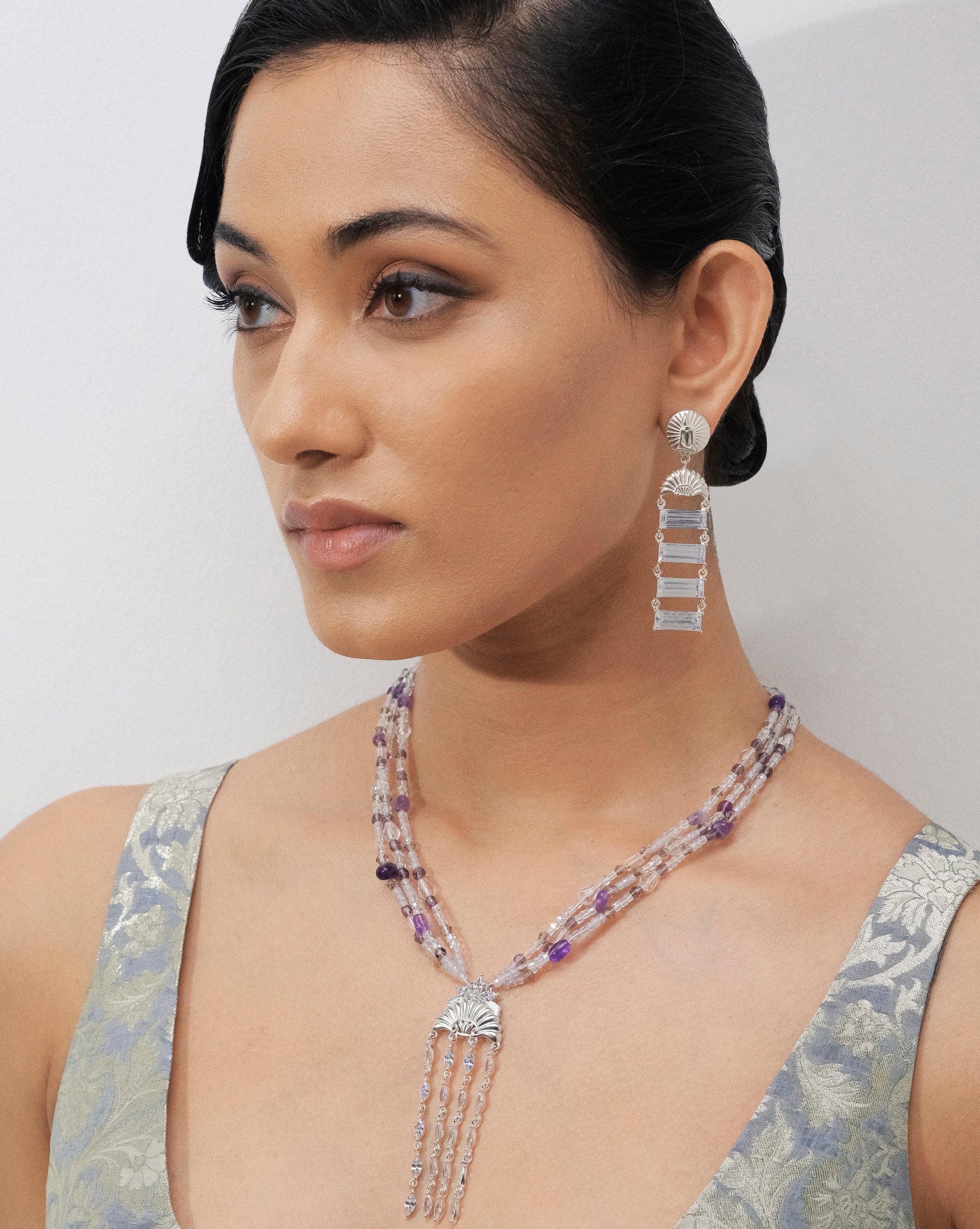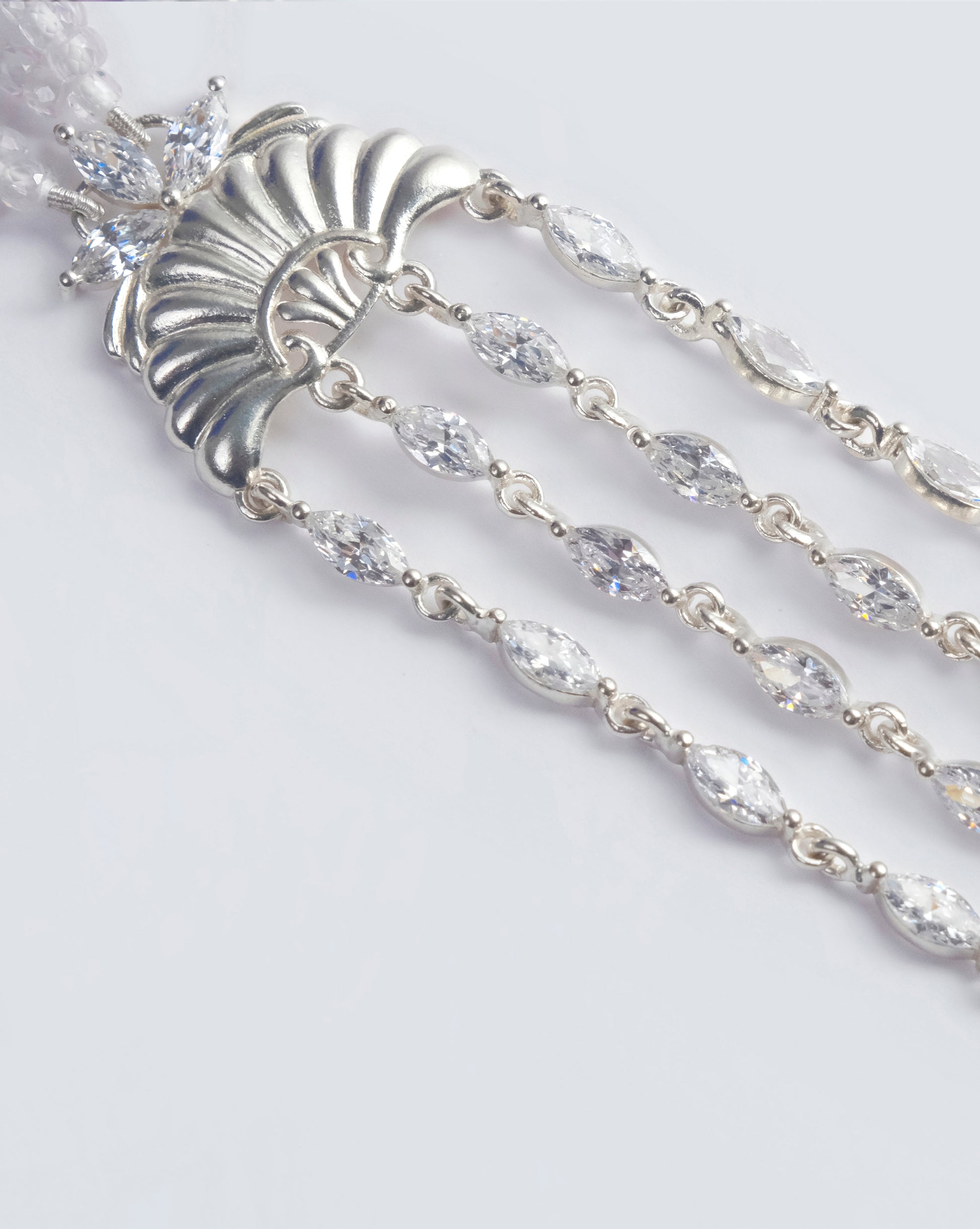 Inspired by the form of a sea-shell, with cascading drops of white marquise crystals, the 'Marine Treasure' necklace is truly a hero of our collection. Many different and unique varities of beads have been artfully woven together to create this one-of-a-kind harmony of colours, texture and shine that blend marvellously with the brilliance of silver. Wear this with a small solitaire earring or any of the bigger statemnt earrings from our collection.