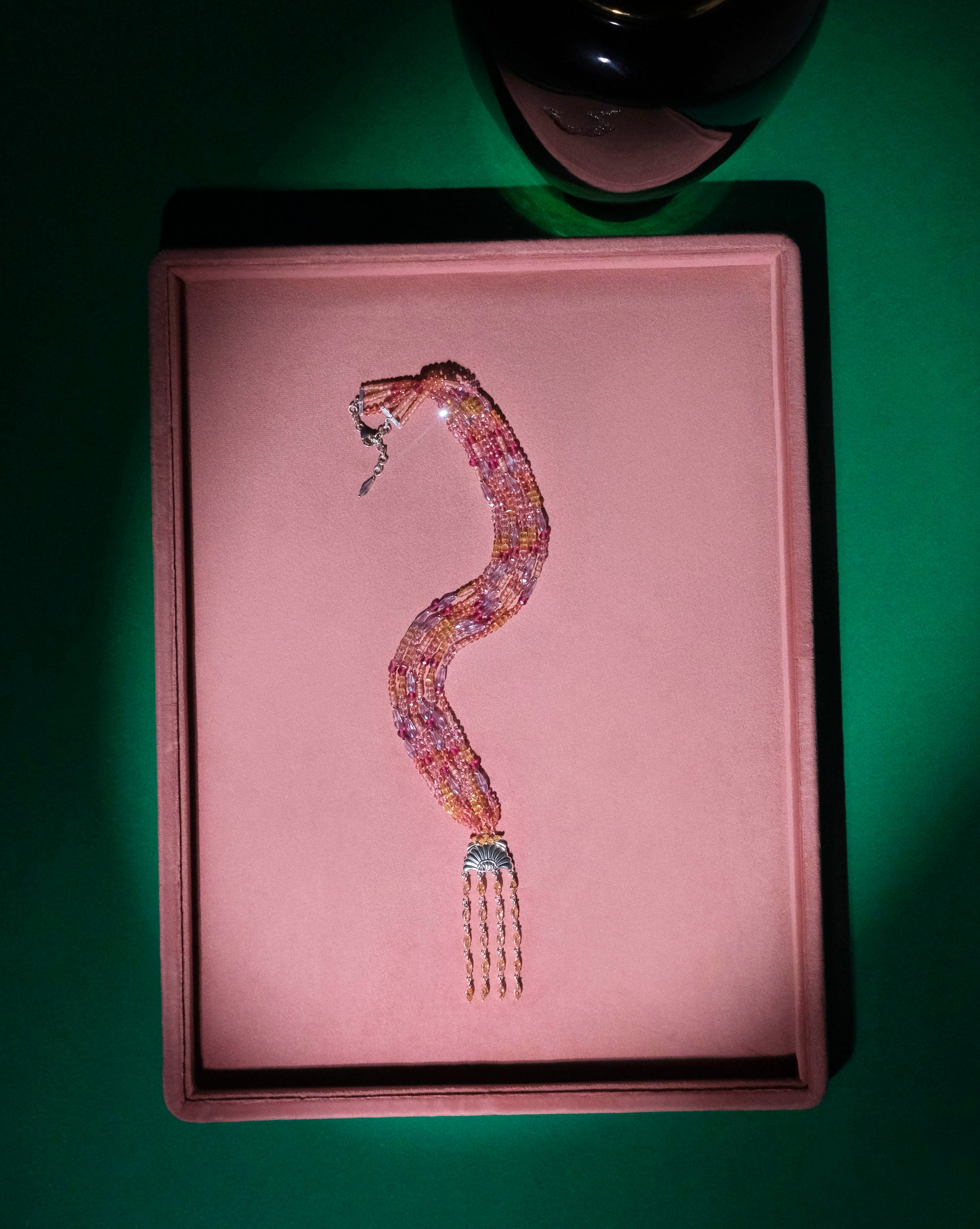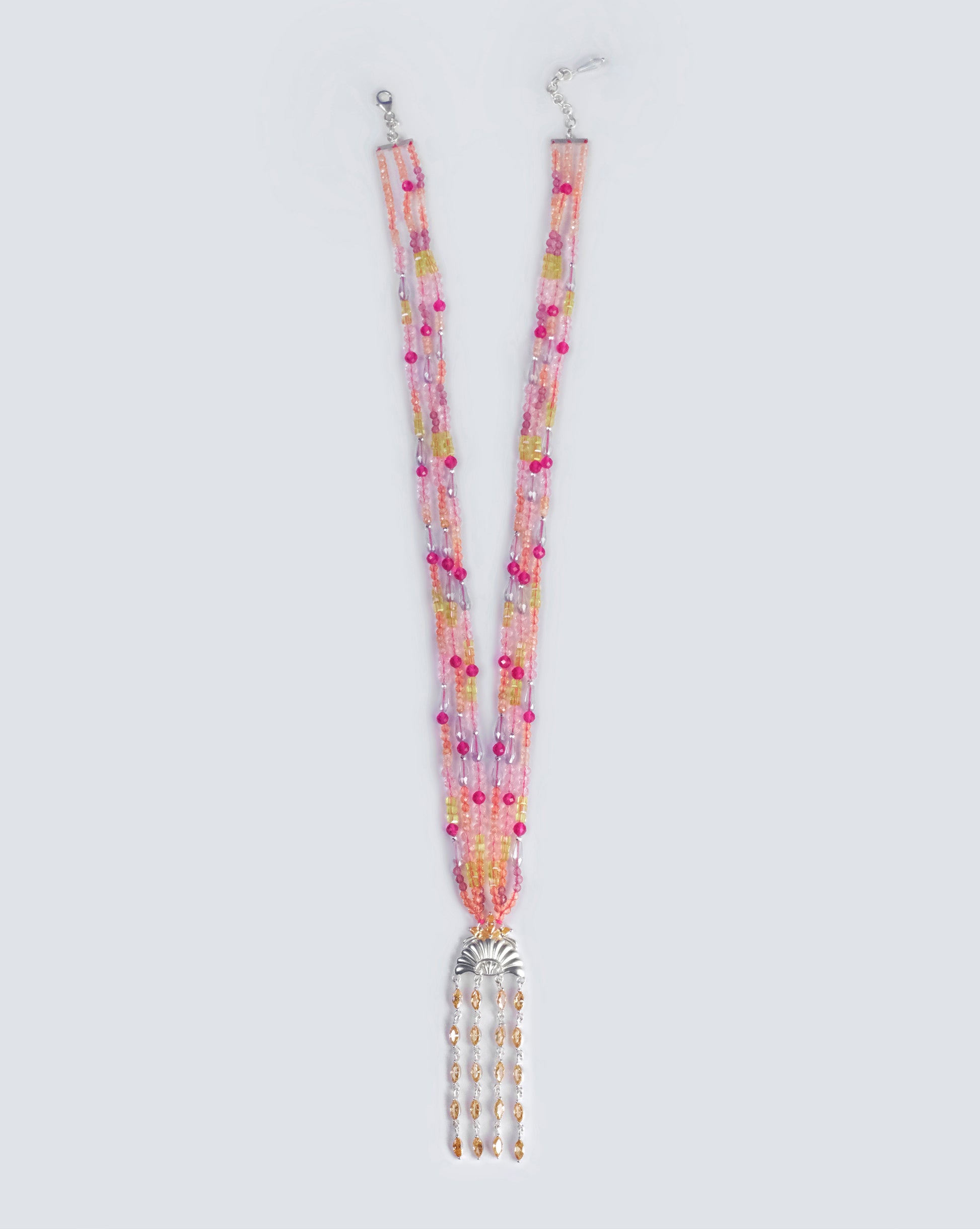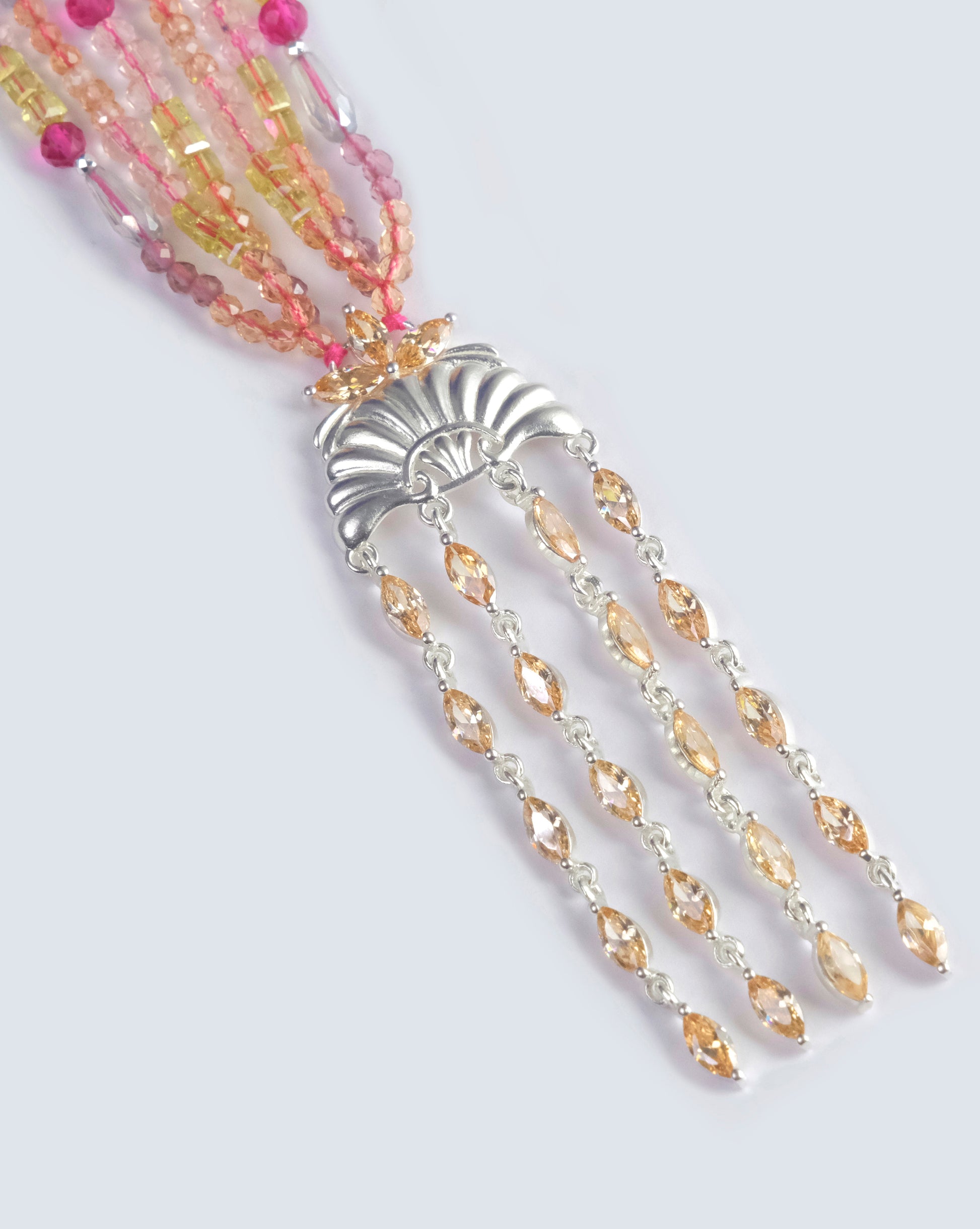 Inspired by the form of a sea-shell, with cascading drops of champagne marquise crystals, the 'Marine Treasure' necklace is truly a hero of our collection. Many different and unique varities of beads have been artfully woven together to create this one-of-a-kind harmony of colours, texture and shine that blend marvellously with the brilliance of silver. Wear this with a small solitaire earring or any of the bigger statemnt earrings from our collection.