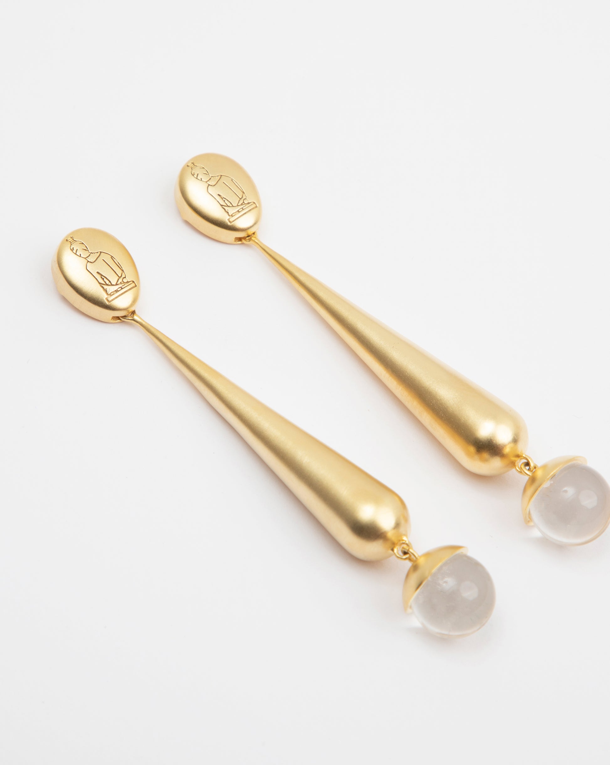 Truly eye-catching earrings, shaped like a column, feature a solid Clear Quartz gemstone and Apara Disum scultpure logo engraved on the top. The simple yet enigmatic design is sure to elevate any look.