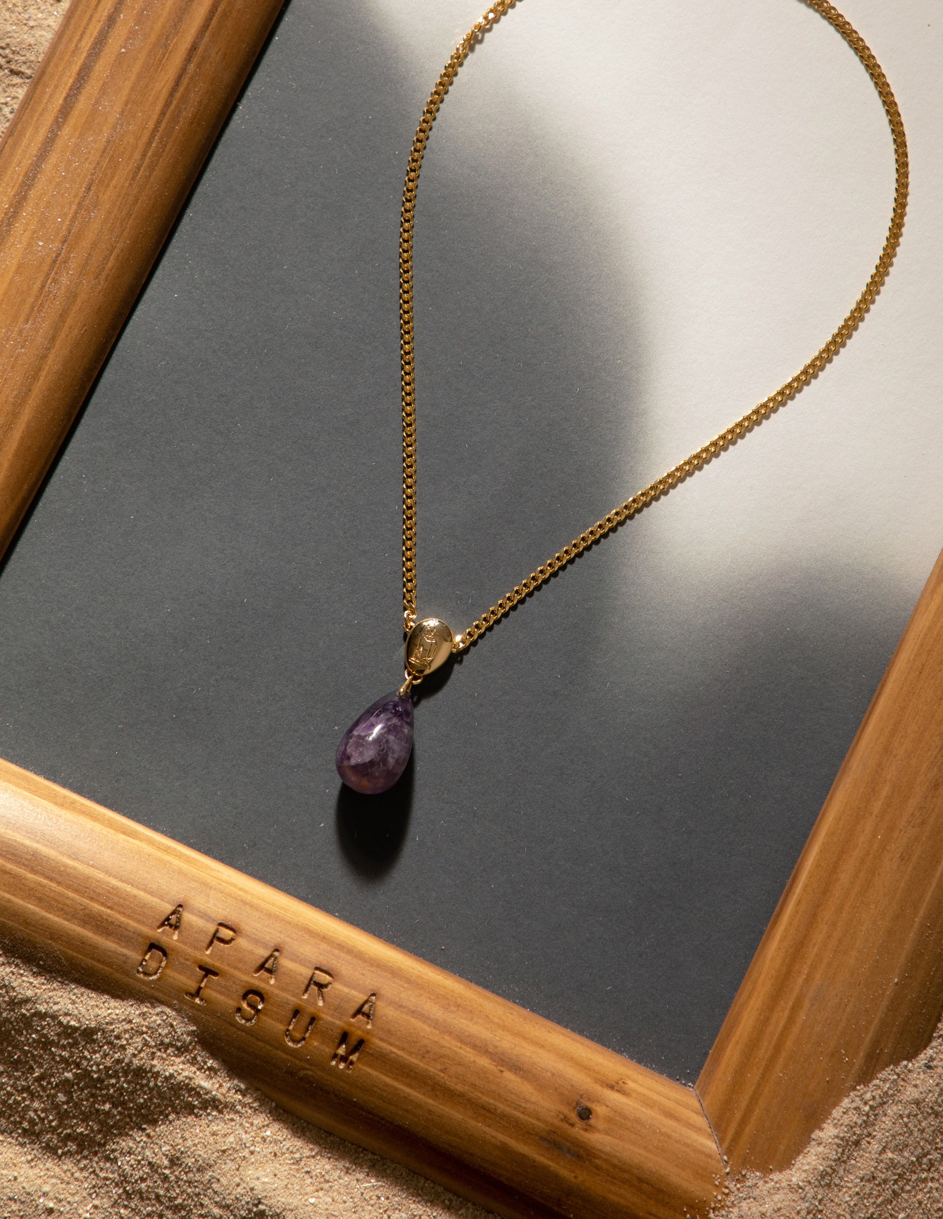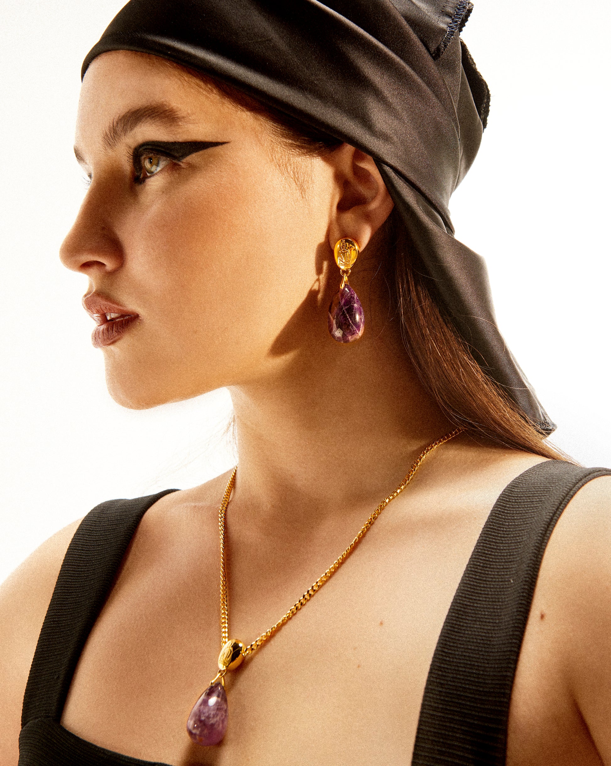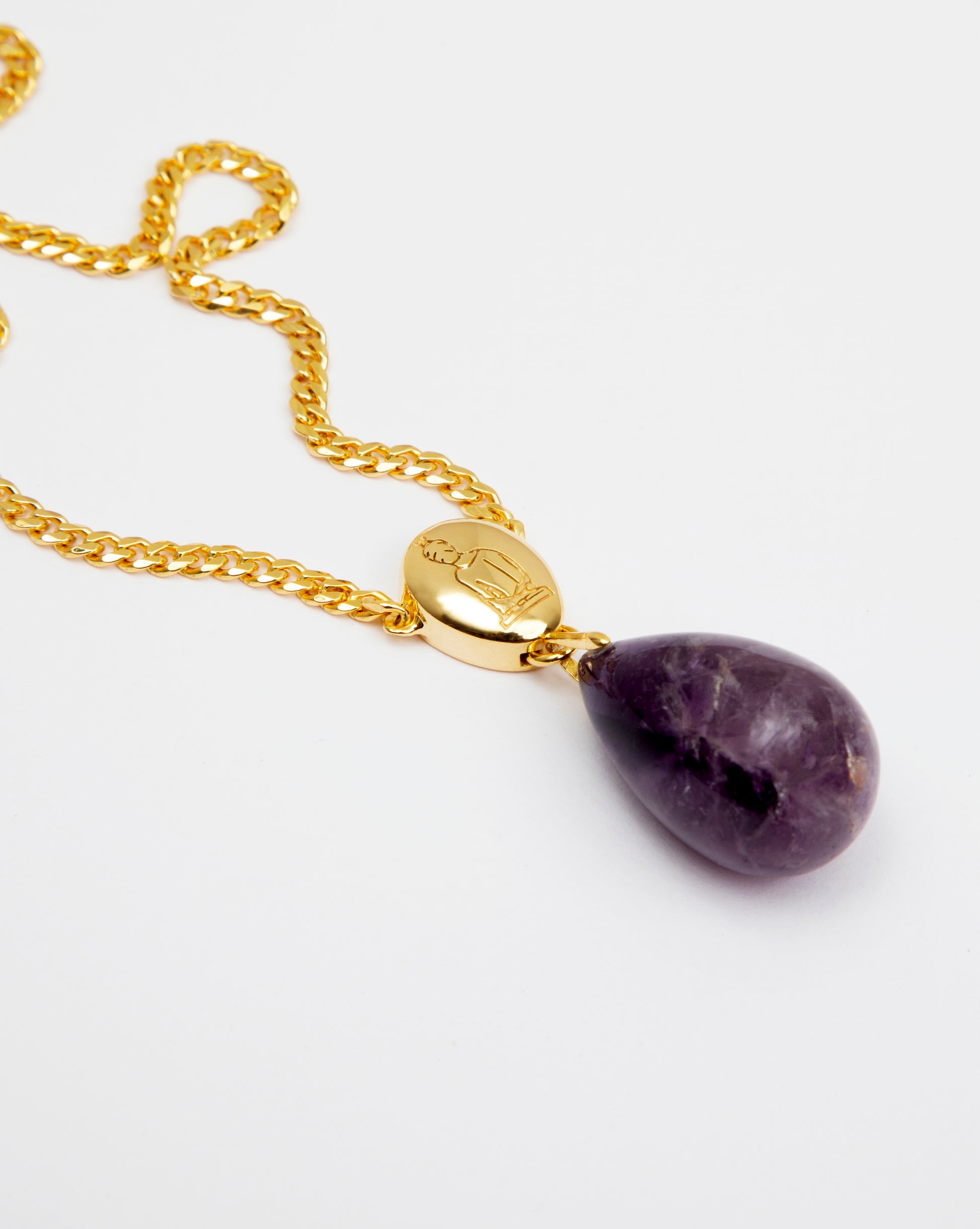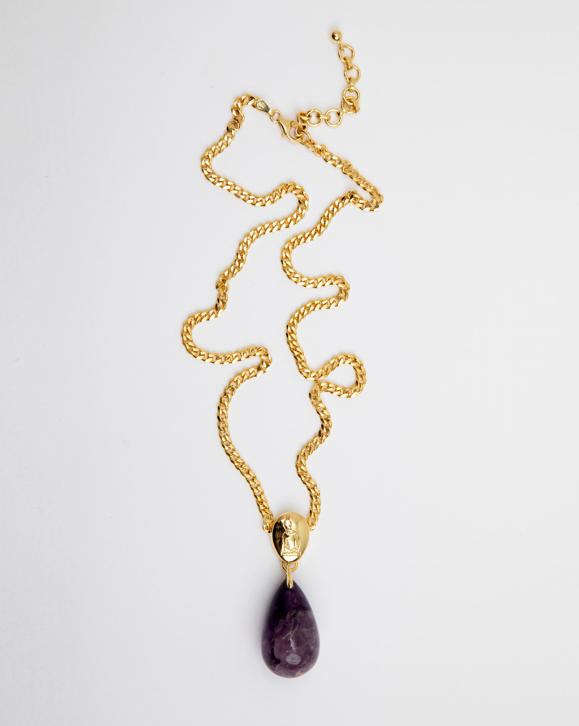 A magnificient hand-carved Amethyst drops audaciously from the engraved centerpiece chained to a delicate cuban link. This pendant necklace can be worn alone or coupled with it's earring set to complete the look.