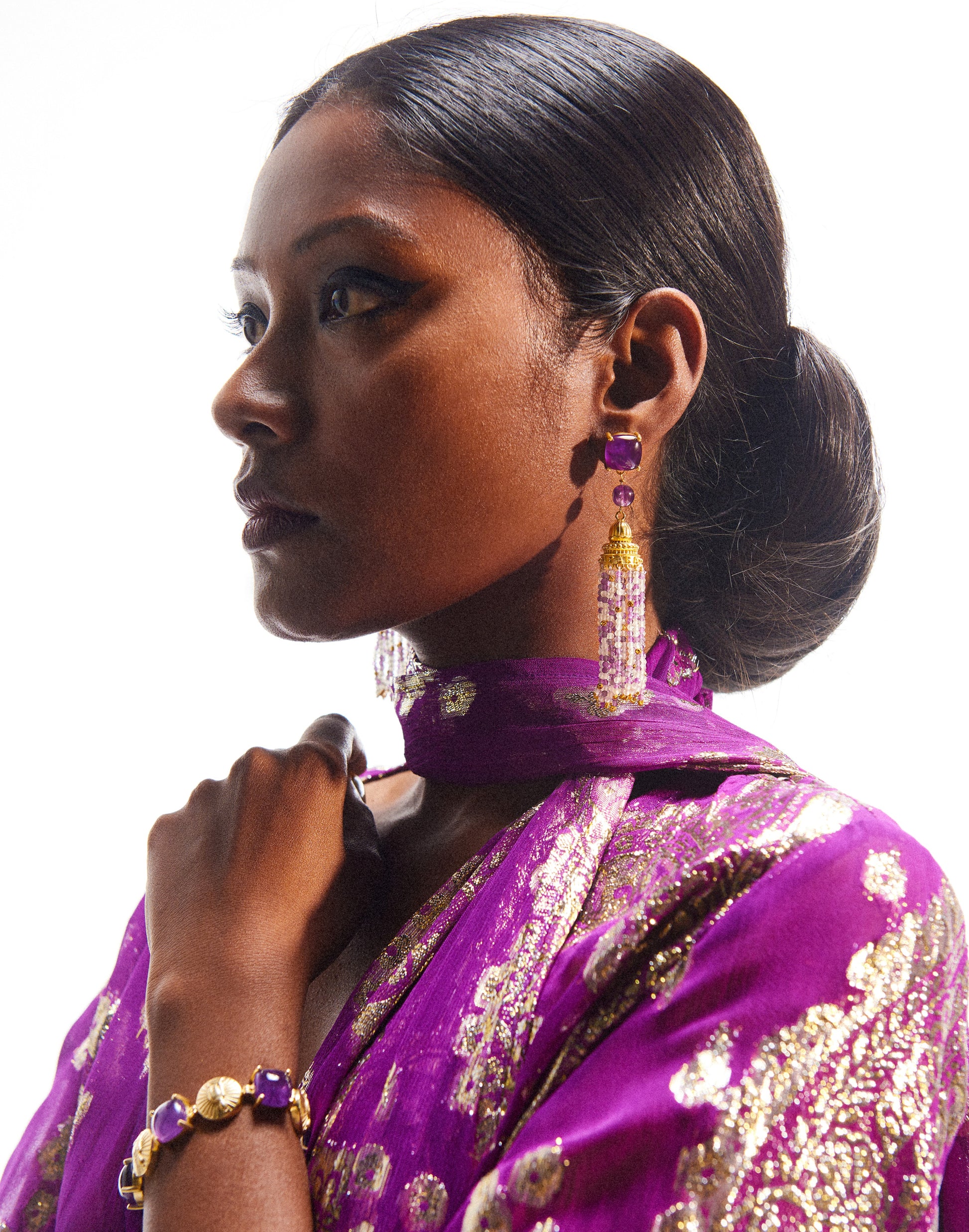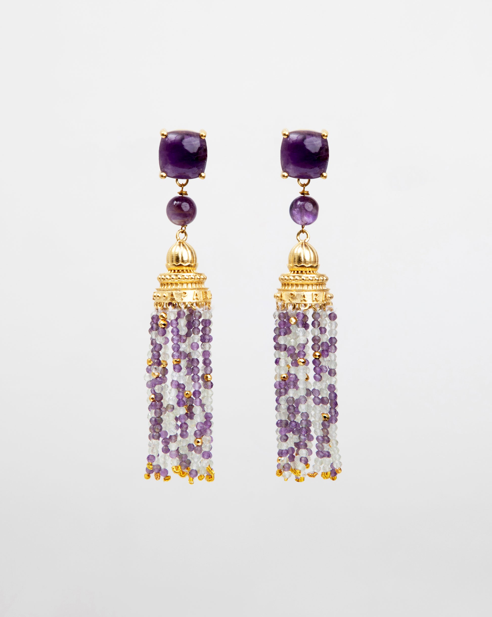 These architecture inspired earrings feature a cascading tassel of pure and precious Amethyst, Quartz and golden Pyrite beads. The dome structure has a subtle Apara Disum text pattern and features a cushion shaped Amethyst cabochon topstone and round beads.