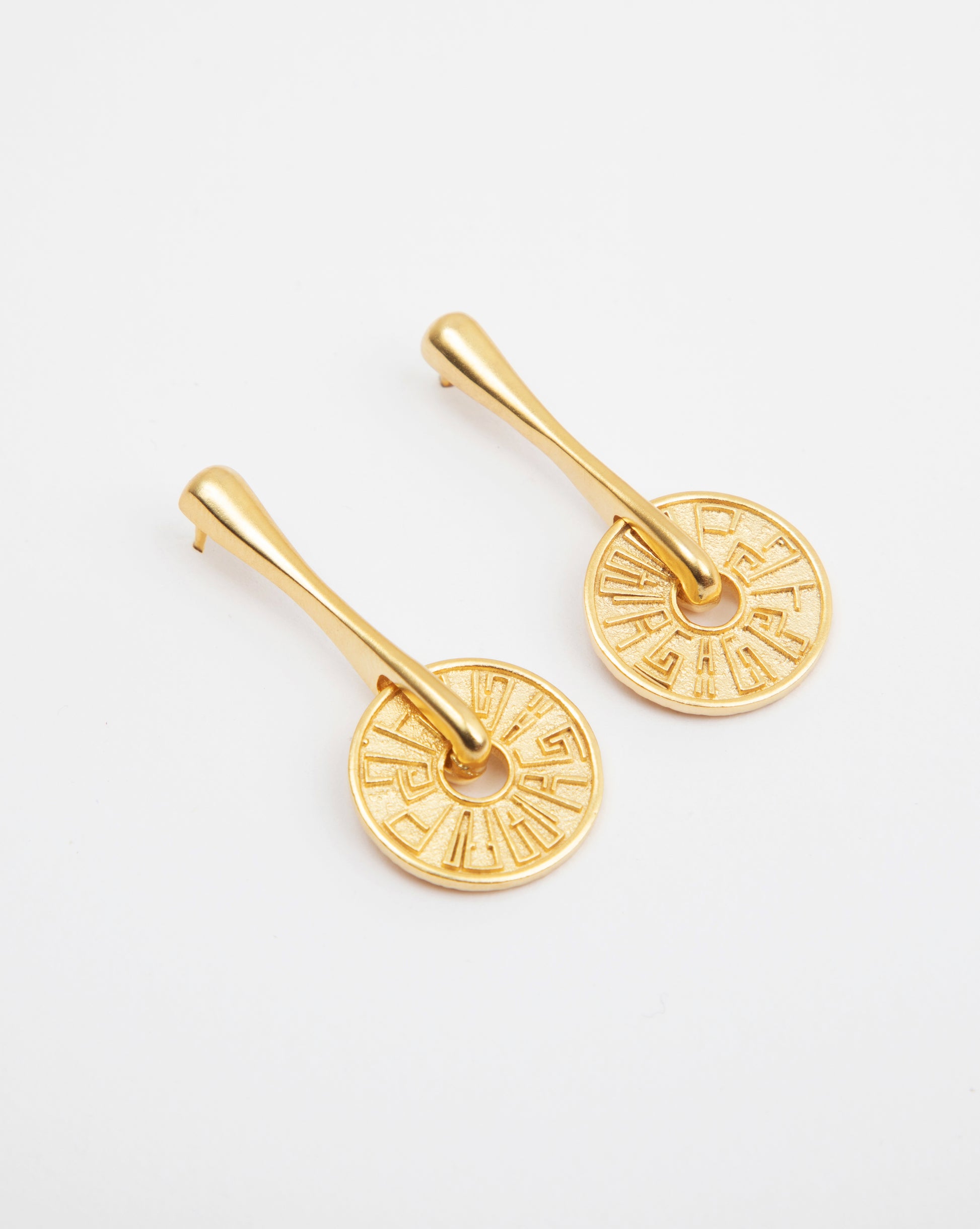These lightweight earrings feature a rotating wheel with an ornamental script pattern that reads the brand name in a surreal, obscure fashion, reminiscent of ancient artefacts and patterns.