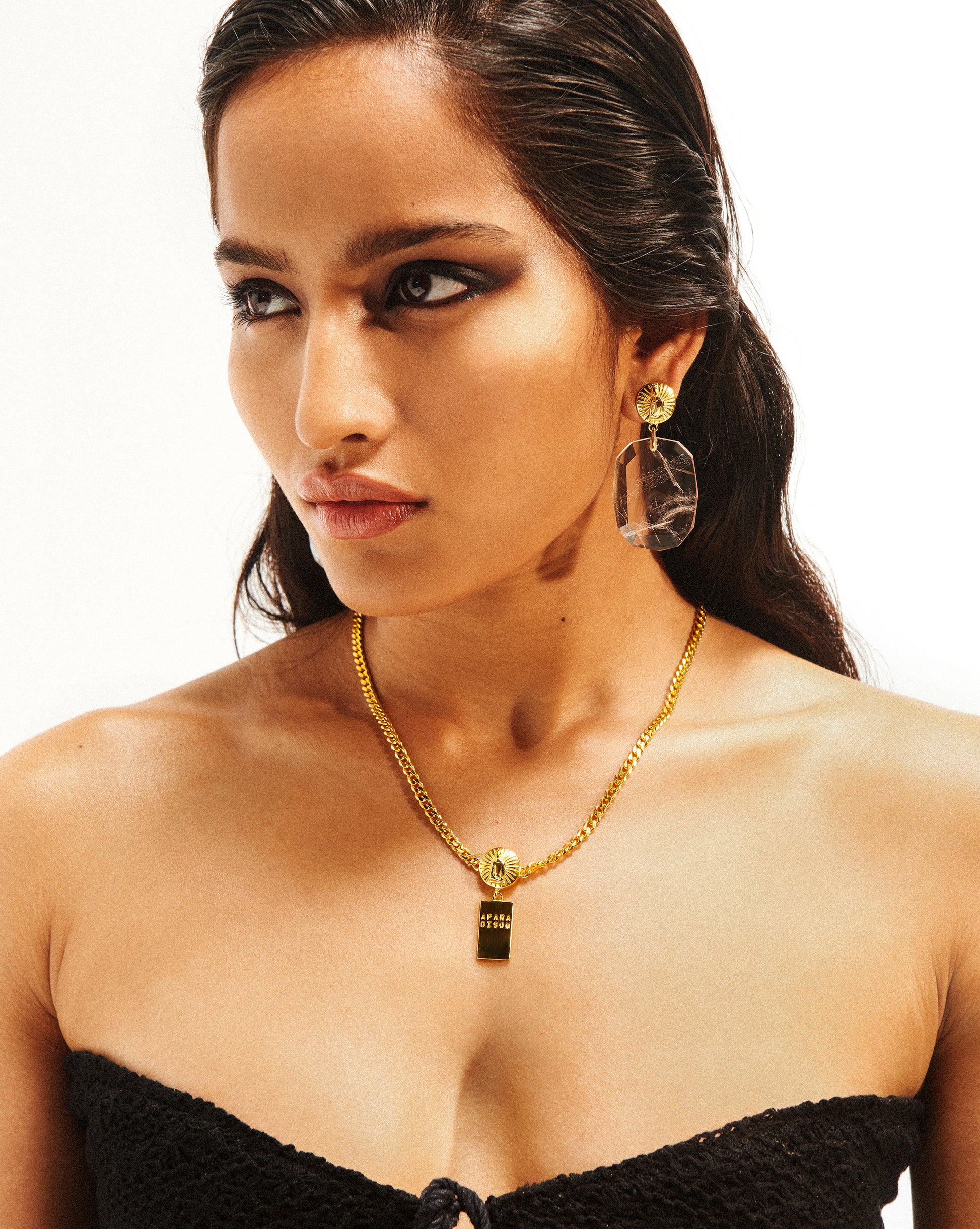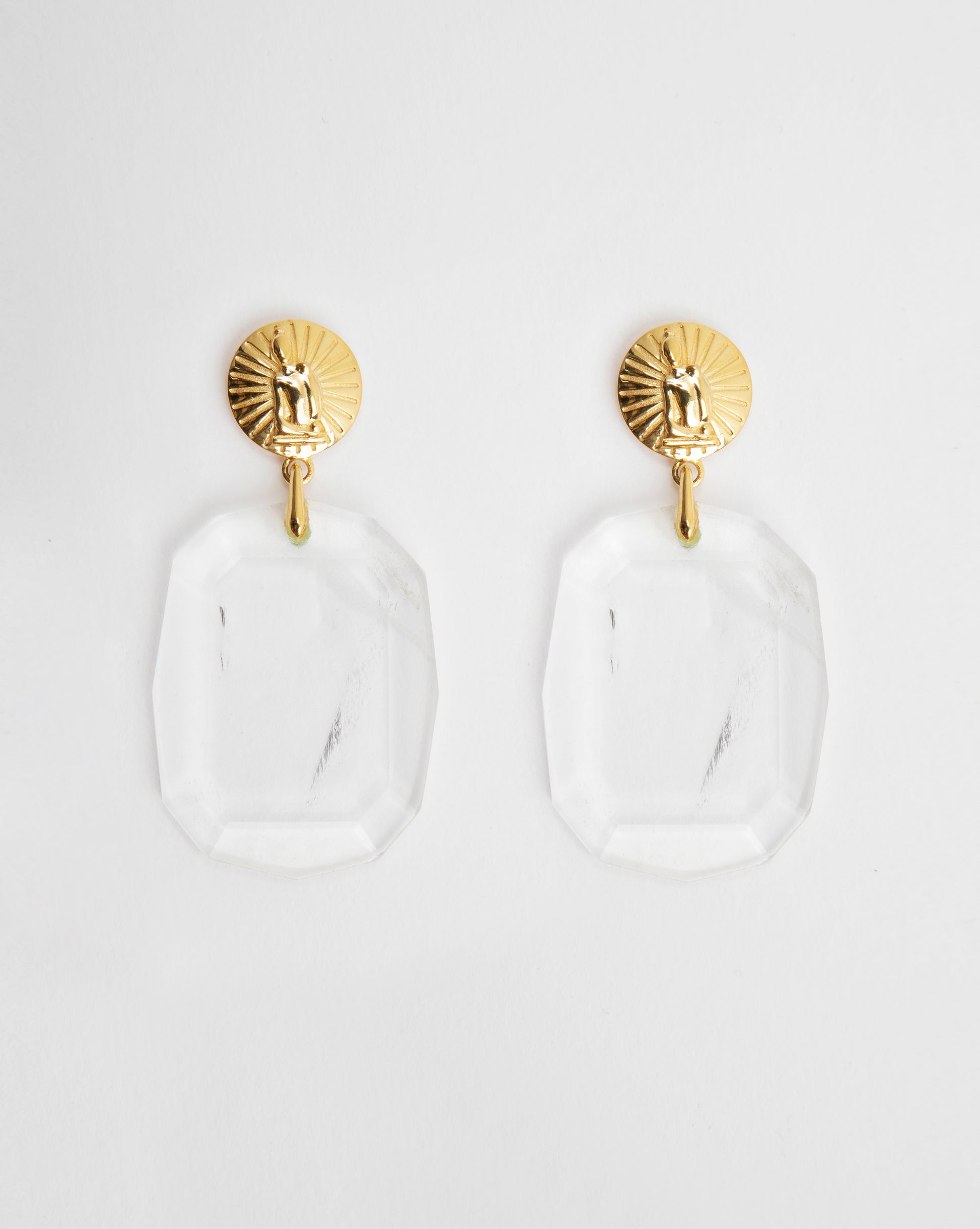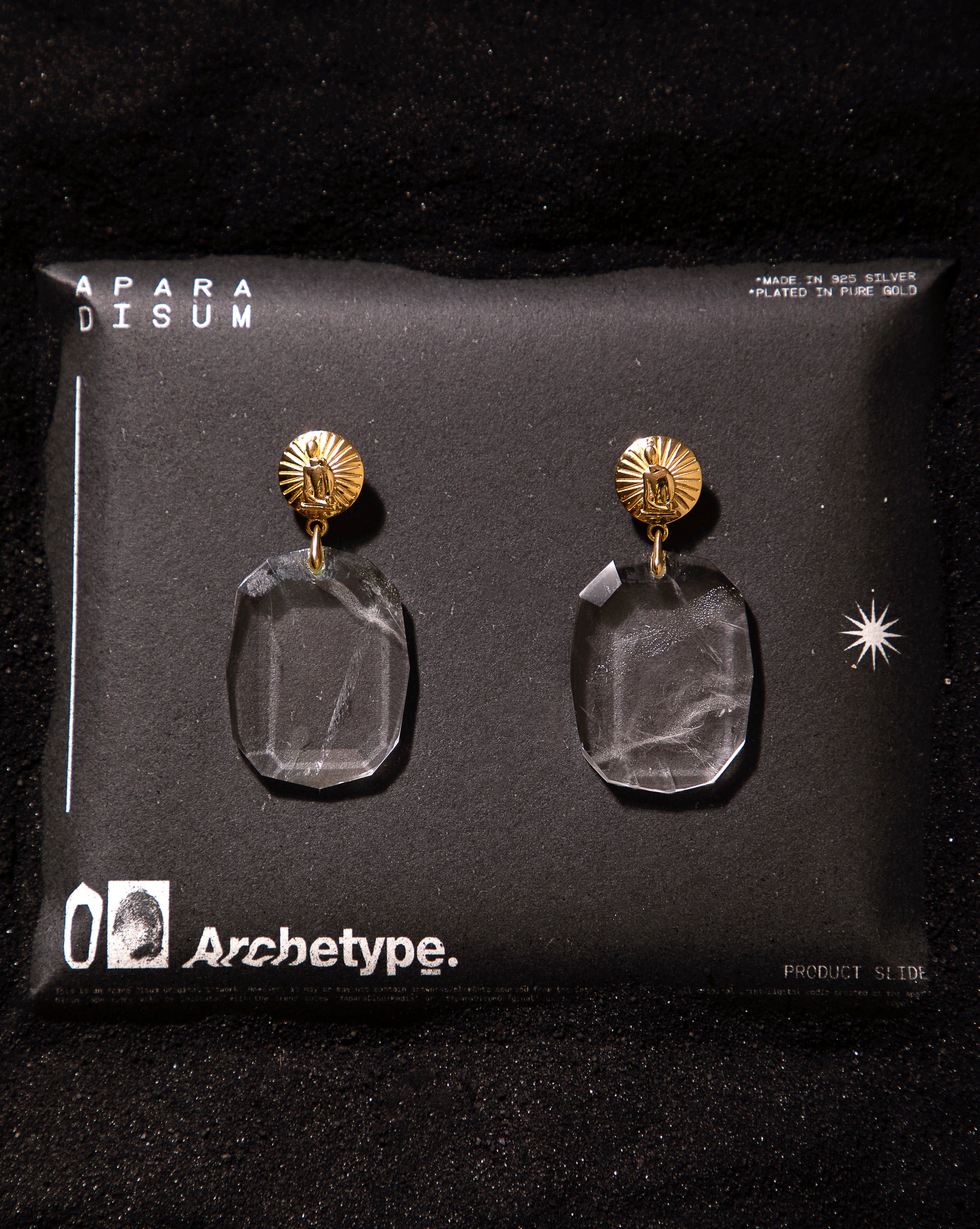These opulent earrings feature a massive transparent Clear-Quartz faceted drop dangling from a goldplated round top with Apara Disum sculpture logo embossing.