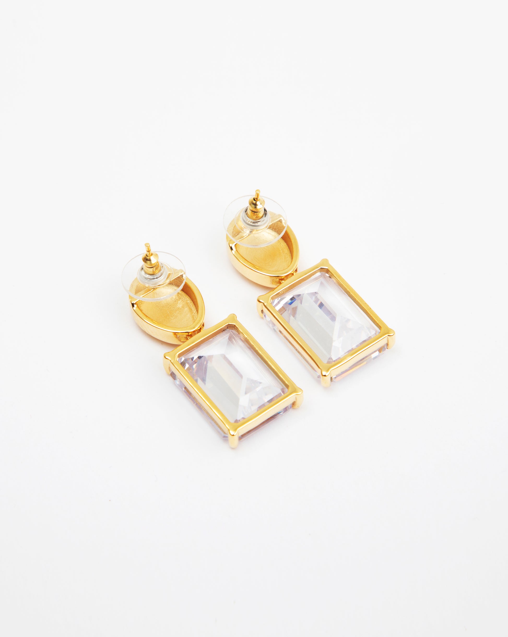 A classic pair of solitaire earrings, featuring a large white Octagon cut CZ stone and a high-polish gold top with Apara Disum logo engraving. These stunning earrings are minimal in design and heroic in character.