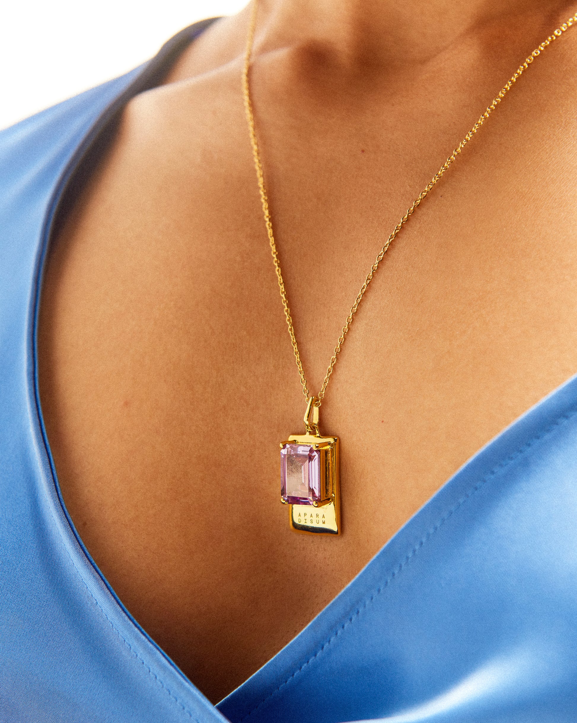 A dazzling purple crystal sits proudly on a sublime platform, just like a mausoleum sitting on its bed of marble. Carefully engraved Apara Disum brand logo further adds grace and allure to this minimalistic pendant.