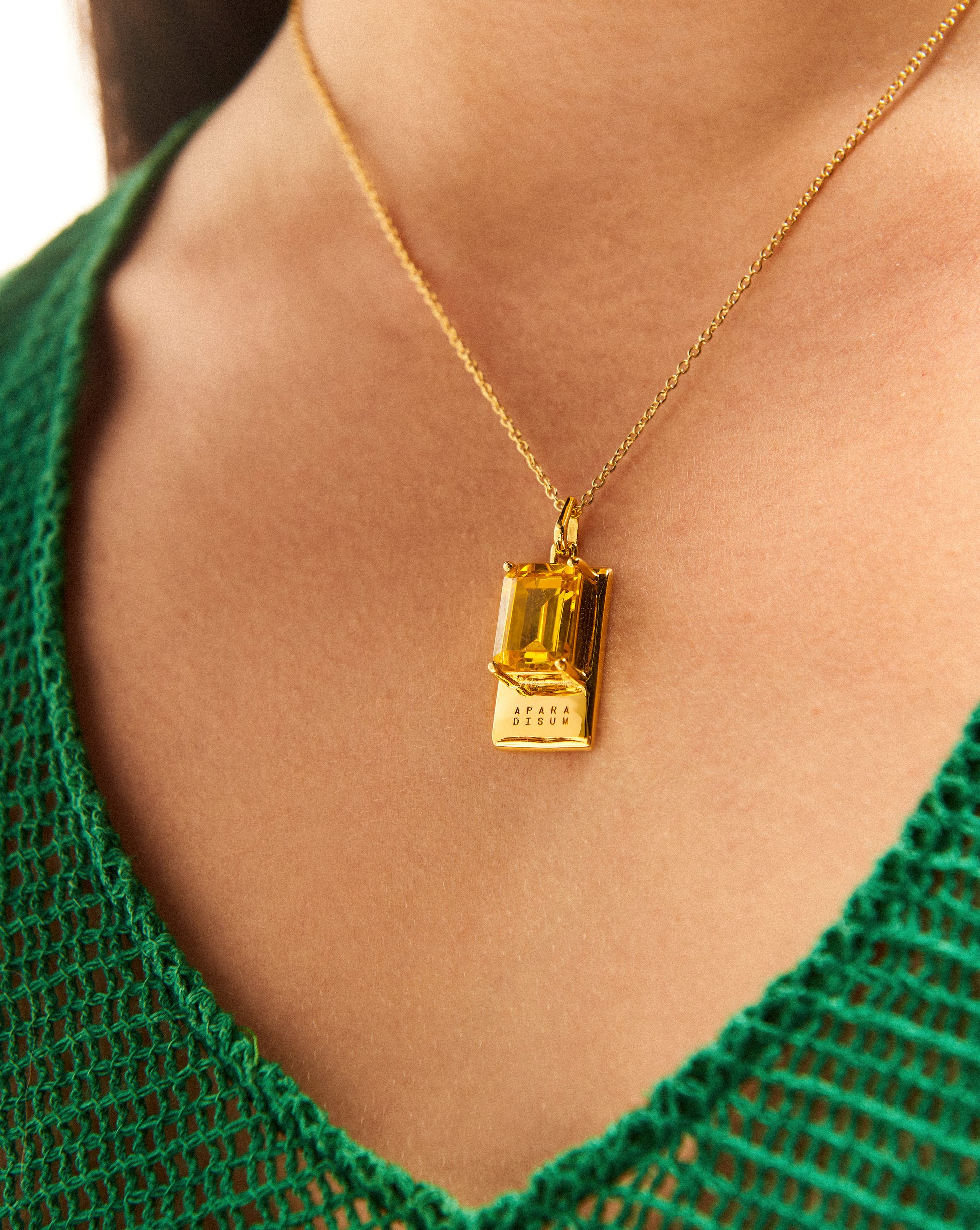 A dazzling yellow crystal sits proudly on a sublime platform, just like a mausoleum sitting on its bed of marble. Carefully engraved Apara Disum brand logo further adds grace and allure to this minimalistic pendant.