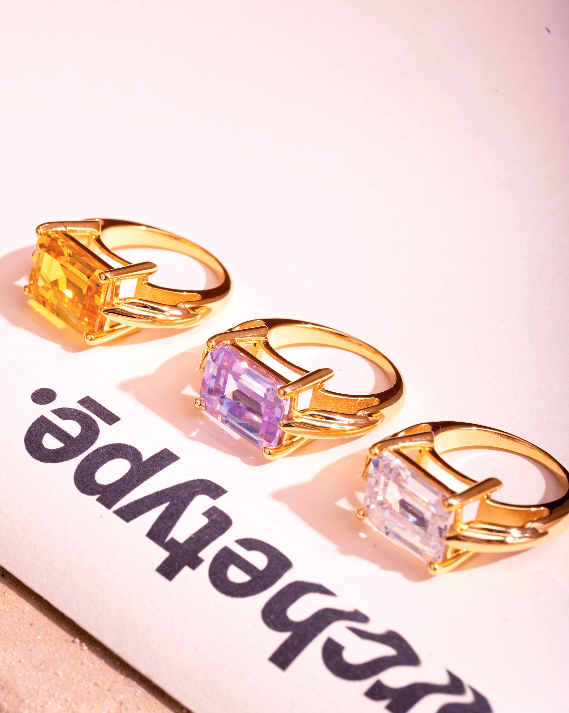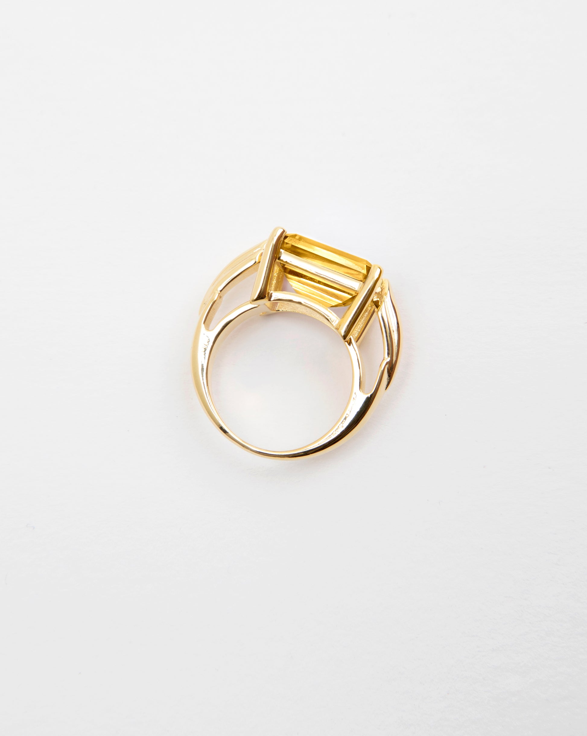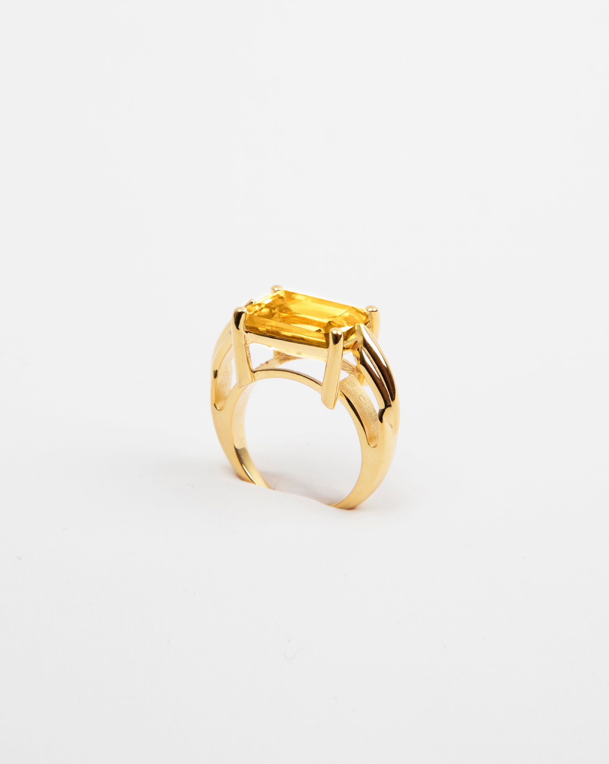 The Zementine ring has a dazzling crystal centerstone that is illuminated with an operatic prong setting. A statement, yellow solitaire ring that radiates light and beauty.